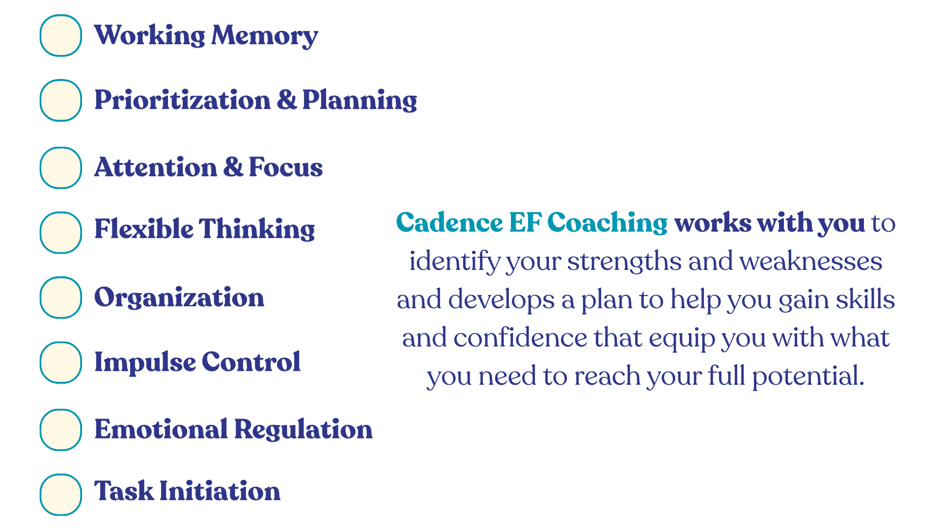 Cadence Executive Function Coaching exists to help people find their rhythm—not by pushing harder, but by building systems that actually fit how their brains work.